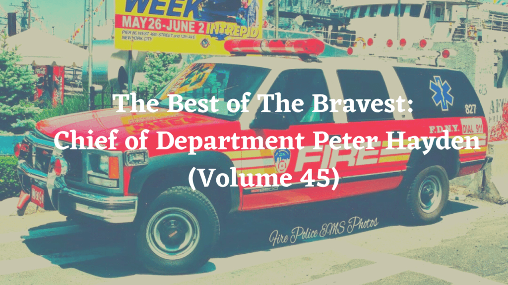 Who am I talking about? Chief of Department Pete Hayden of course who’ll join me for Volume 45 of The Best of The Bravest: Interviews With The FDNY’s Elite. A special thanks goes out to my friend NYPD Emergency Service Unit Lieutenant Keith Gallagher who played a pivotal role in helping this interview come to fruition. He won’t want the credit, but I’d be remiss not to acknowledge him. He deserves it.