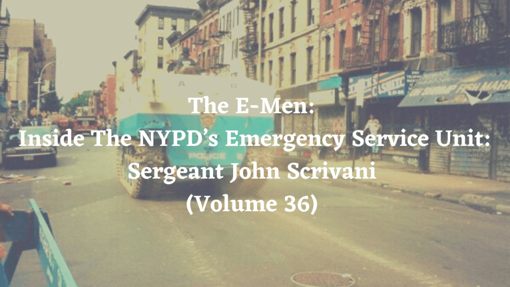 Having arrived to ESU in 1998, he’d work Brooklyn in Truck 6, and got a dose of Hollywood in Truck 1. A veteran of both sides of ESU, he was both a police officer and later boss in the unit, having made Sergeant in August 2001, just a month before ESU and the NYPD’s most devastating day. He’s John Scrivani, it’s been a long time coming to get him on and he’ll join me for Volume 36 of The E-Men: Inside The NYPD’s Emergency Service Unit.