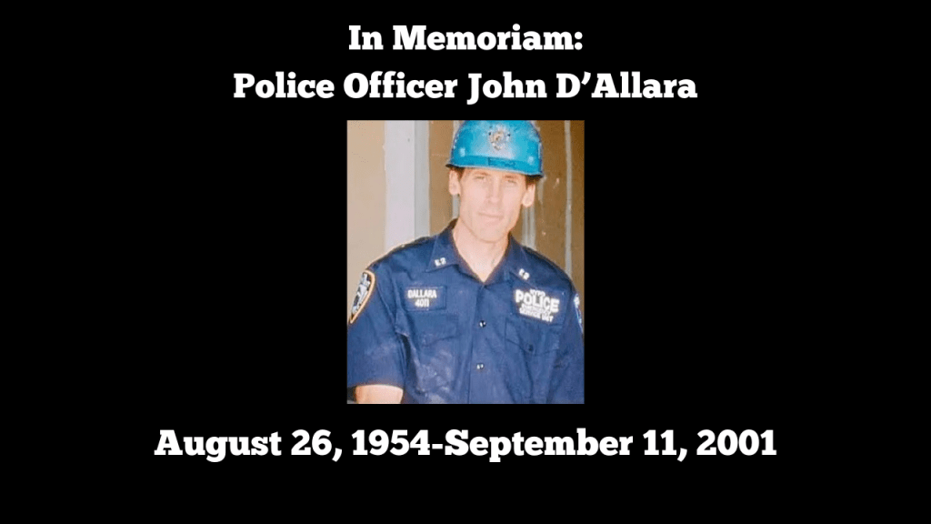 Despite the overwhelming chaos of the moment, D’Allara remained as calm as can be, even warmly greeting Detective McNally, of whom he had served as a police officer with in The Bronx during the earlier days of their career. “In that indescribable backdrop of devastation and danger there was still the handshake and warm ‘hi Danny’”, McNally wrote in a November 2001 letter to the D’Allara family.