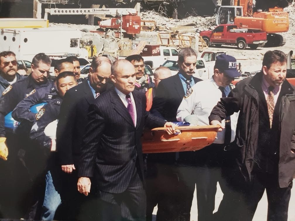 Moments prior as Detective McNally described, he and Detective Richards had met up with Sergeant Curtin on the plaza, asking the team what they needed, Sergeant Curtin requested the detectives head down to West and Vesey Street where numerous ambulances had been staged and retrieve for the team a backboard.
